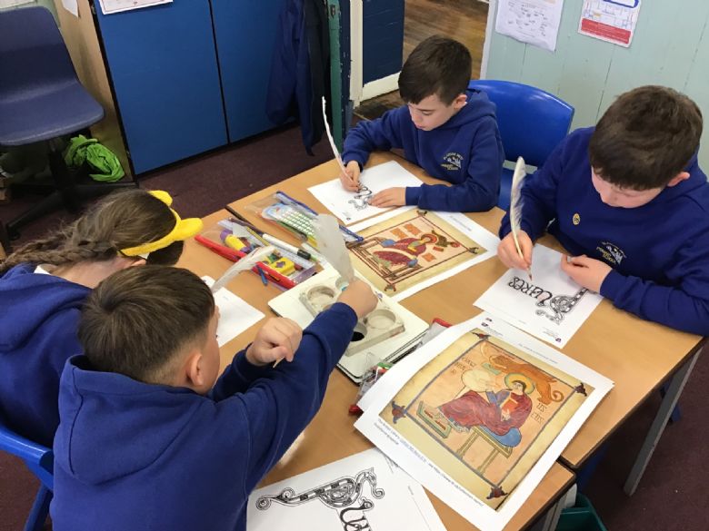We then spent time looking at and exploring the Lindisfarne Gospels; looking for clues hidden in images as well as looking at a copy of the book worth £20,000! After that, we had a go at creating artwork based on the images we studied. We did this using the techniques used when the Gospels were created by using a quill and ink. To sign our artwork we used Uncial script which was used in the Lindisfarne Gospels.